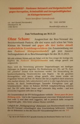 Ohne Scham: Ausgerechnet der Rest-Vorstand des Bezirksverbands Pankow, alle drei waren auch schon bei Viola Kleinau im Vorstand und gegen alle drei laufen aktuell strafrechtliche Ermittlungsverfahren (im Zusammenhang mit dem Pankower Kleingartenskandal)1 gab jetzt massive Stellungnahmen ab zu Beschlussanträgen für den 30.11.2023.